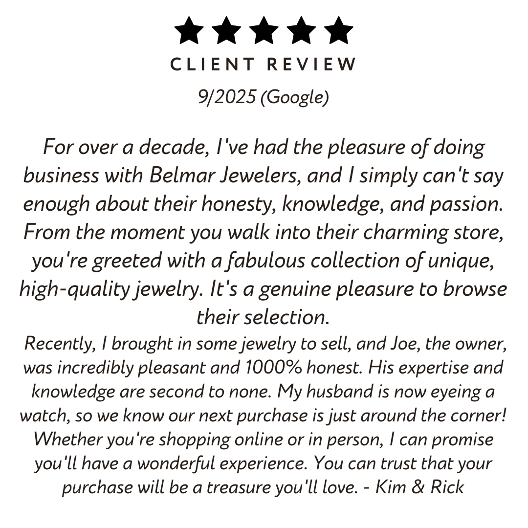 Come to Belmar Jewelers for expert evaluations of your jewelry, diamonds, silver, watches and coins in a relaxed and friendly environment. If you'd like to sell your items we're here for you, but there's no obligation or appointment necessary.