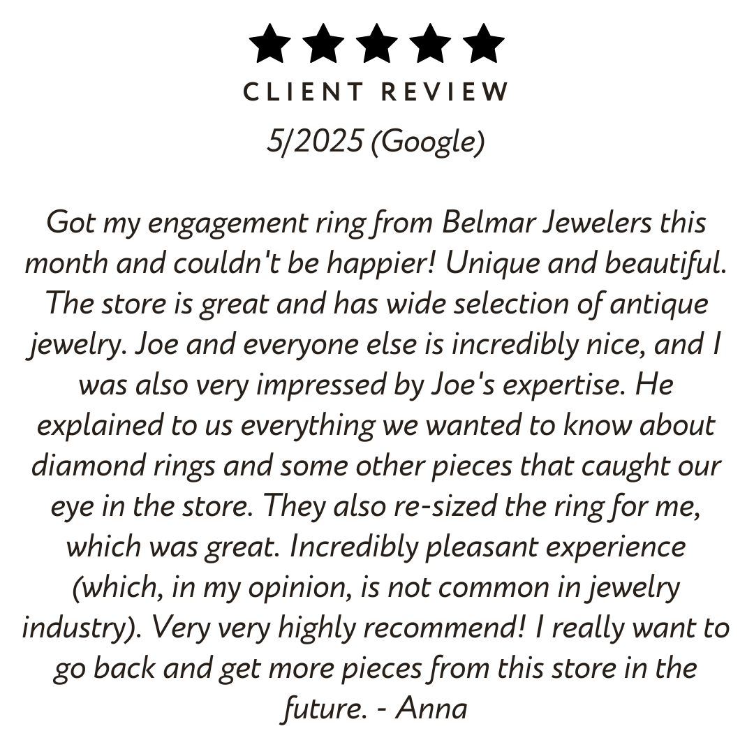 Belmar Jewelers opened a boutique jewelry store in the seashore town of Belmar, NJ in 2006 and specializes in vintage, estate and antique jewelry including Victorian, Edwardian, Belle Epoque, Art Deco, Retro and Mid-Century eras.