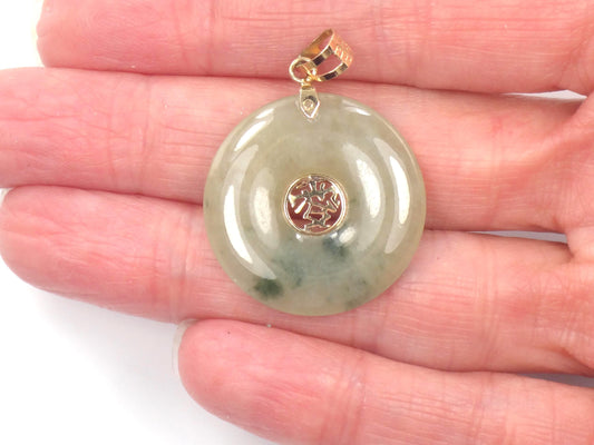 Vintage 14k Gold Green Jade Disc Pendant: Prosperity